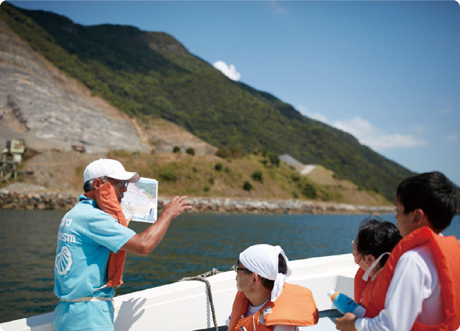 船上では、御所浦で見つかった貴重な恐竜化石や地質について、また御所浦の島々について御所浦ジオツーリズムガイドがレクチャーします。