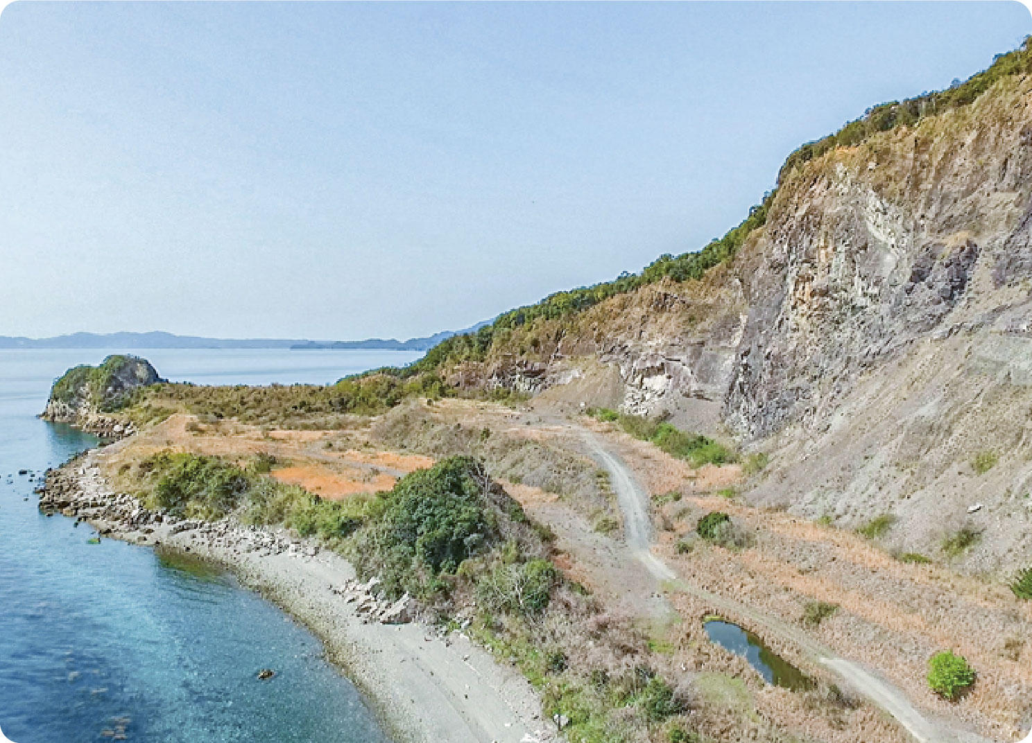 上陸して、化石採集を行う❹採石場跡地。 この場所は、船でしか行くことができないスポットです。採石によって形成された崖面は大迫力の一言です。