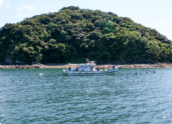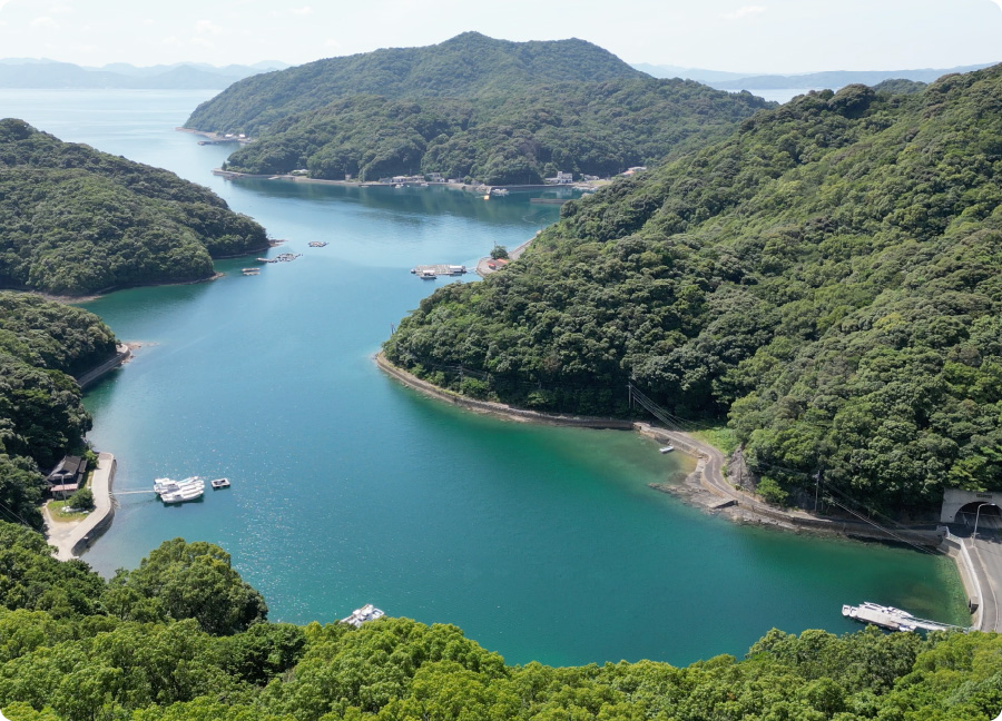 伝馬舟で漕ぎ出す先は、長く入り組んだ入り江。平家の落人伝説も残るこの静かな入り江は、大風の時でも波風が穏やかです。