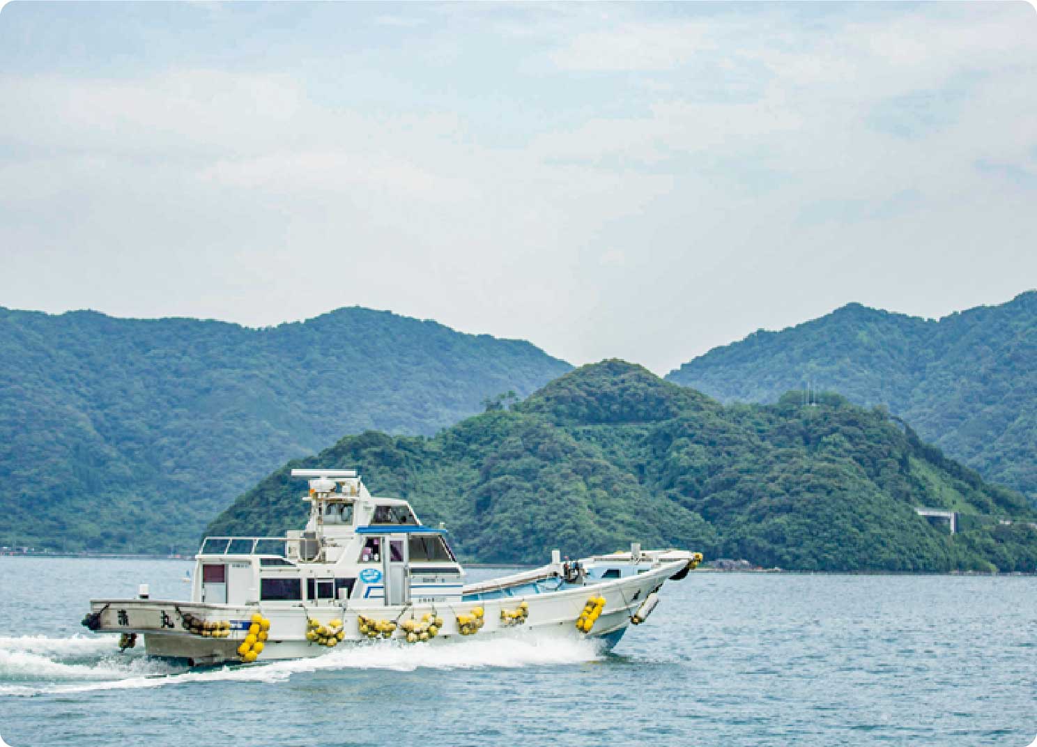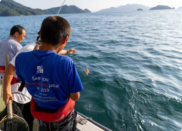 船釣りのスタートは御所浦港から。釣り道具やエサはすでに船長が準備済み。船で漁場へ出発。波の上で島の景色を眺めるだけでも、もう非日常です。
