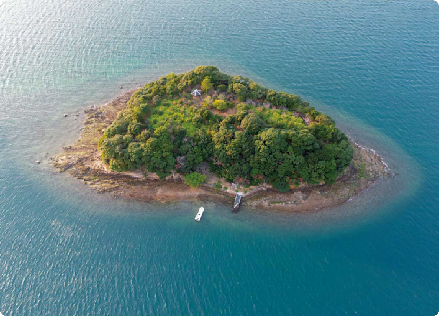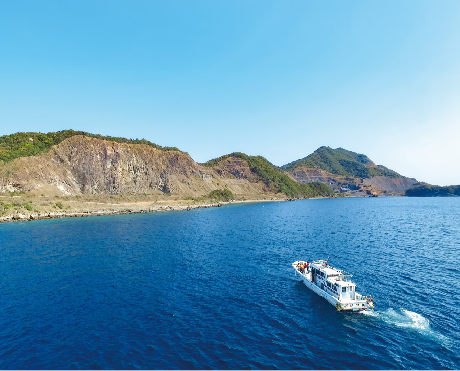 クルージングのスタートは❶御所浦港から。海上タクシーを貸し切って、ガイドと共に乗り込みます。さあ、恐竜の痕跡をたどる冒険へ出発です。