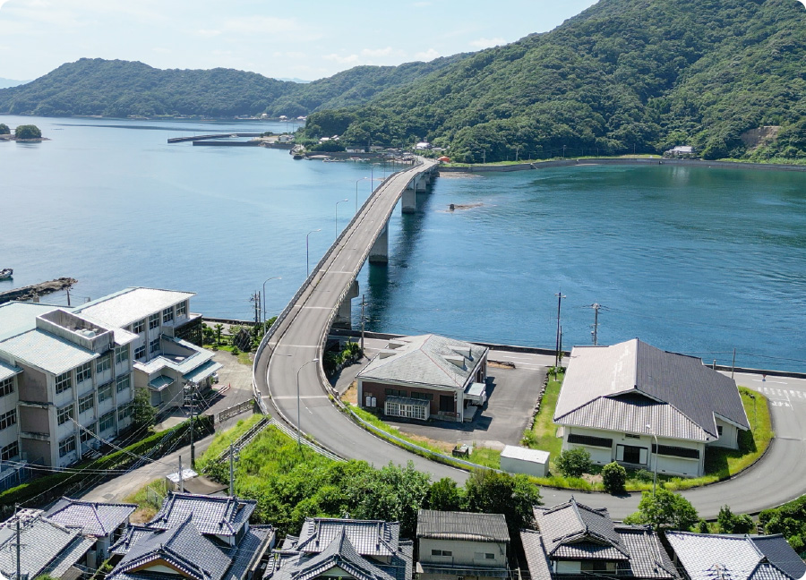 ジャンボタクシーに乗り込んで牧島へ。御所浦島から橋を渡ると牧島。ガイドも同乗するので、移動の案内も楽しめます。