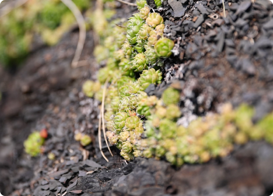 上陸して、化石採集を行う❹日当たりの良い岩場にひっそりと群生するツメレンゲ。環境省レッドリストに指定された準絶滅危惧の多肉植物で、アンモナイト館周辺に自生しています。
